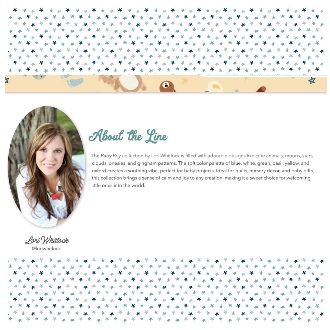 Baby Boy by Lori Whitlock for Riley Blake Designs is great for quilting, apparel and home decor. This print features tossed baby-themed icons.